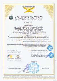 Система организации бережливого производства, применяемая в ООО "КТМЗ" сочетает в себе опыт российских и зарубежных специалистов с новейшими мировыми достижениями в области управления (LEAN & 5S), а разработанная и внедренная система менеджмента качества в соответствии с требованиями международных стандартов серии ISO 9001:2015 позволяет гарантированно обеспечивать качество готовой продукции. В дополнение к этим системам, наша продукция проходит строгий контроль со стороны ОТК, а это паспорта, маршруты и сертификаты на материал, что позволяет обеспечить гарантию на всю продукцию выпускаемую нами.